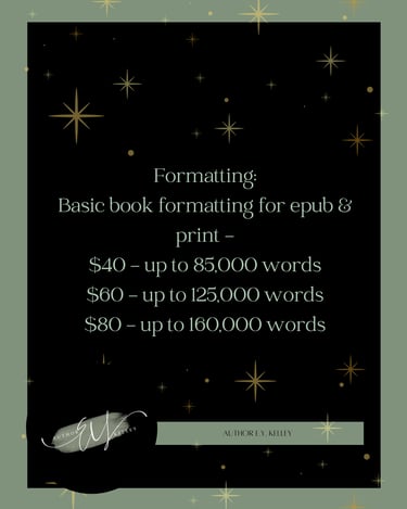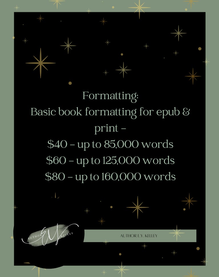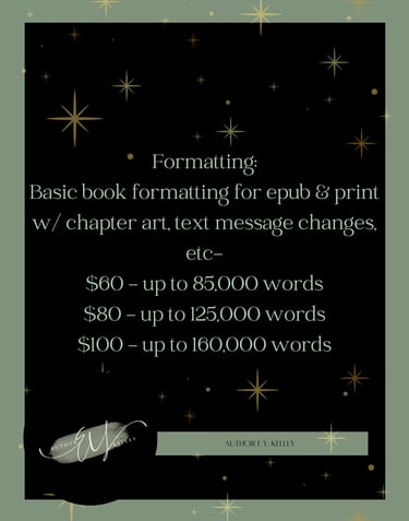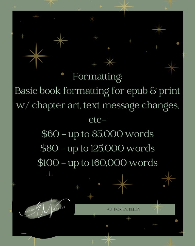 This service will make sure that your book is fully formatted for publication but inclused chapter art, text message formatting, and other specialty items you want added into your book.